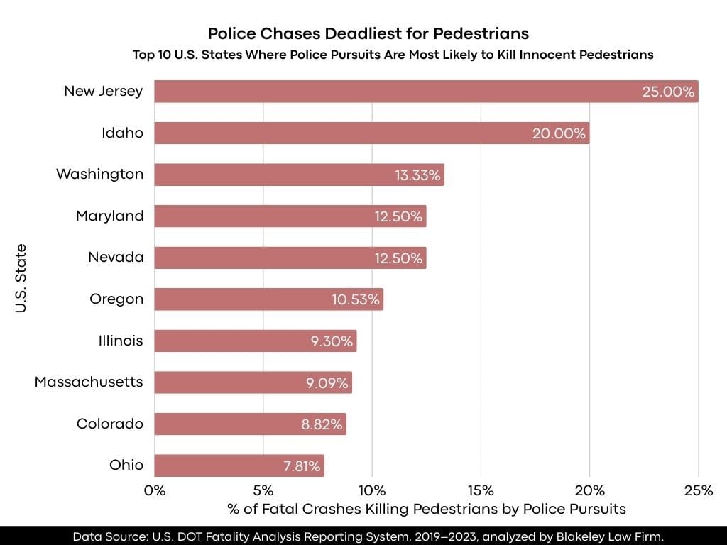 “The data highlights that states such as New Jersey, Idaho, and Washington show some of the highest percentages of fatal police pursuits that end in the deaths of innocent pedestrians.