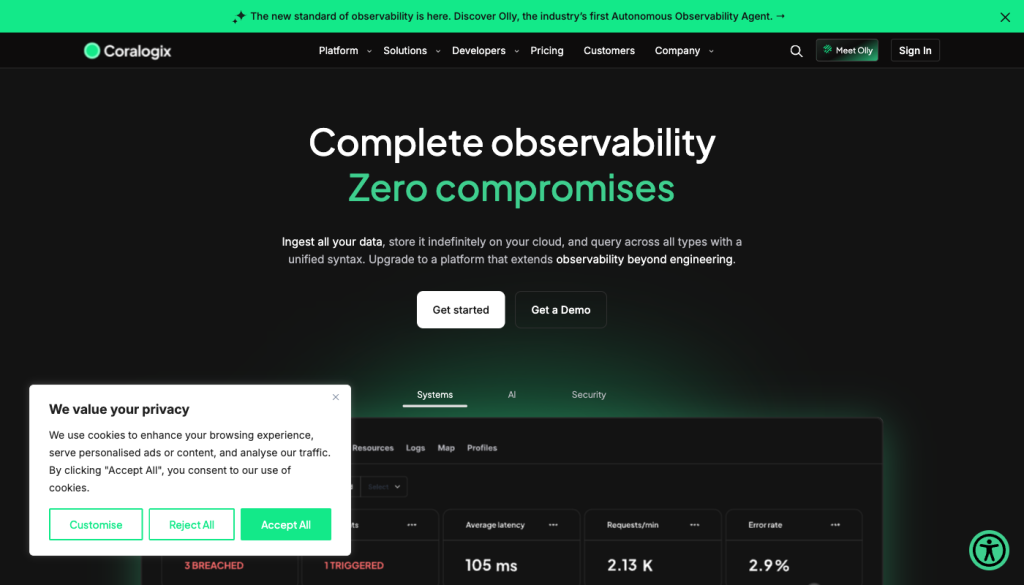 Coralogix takes a different approach to cost control: its Streama engine processes telemetry in-stream, which means teams can monitor up to 4x more data without indexing everything. The TCO Cost Optimizer routes critical logs to instant analysis and low-value telemetry to archive. Data is stored in the customer’s own S3 bucket with infinite retention – a meaningful advantage for compliance-driven teams.