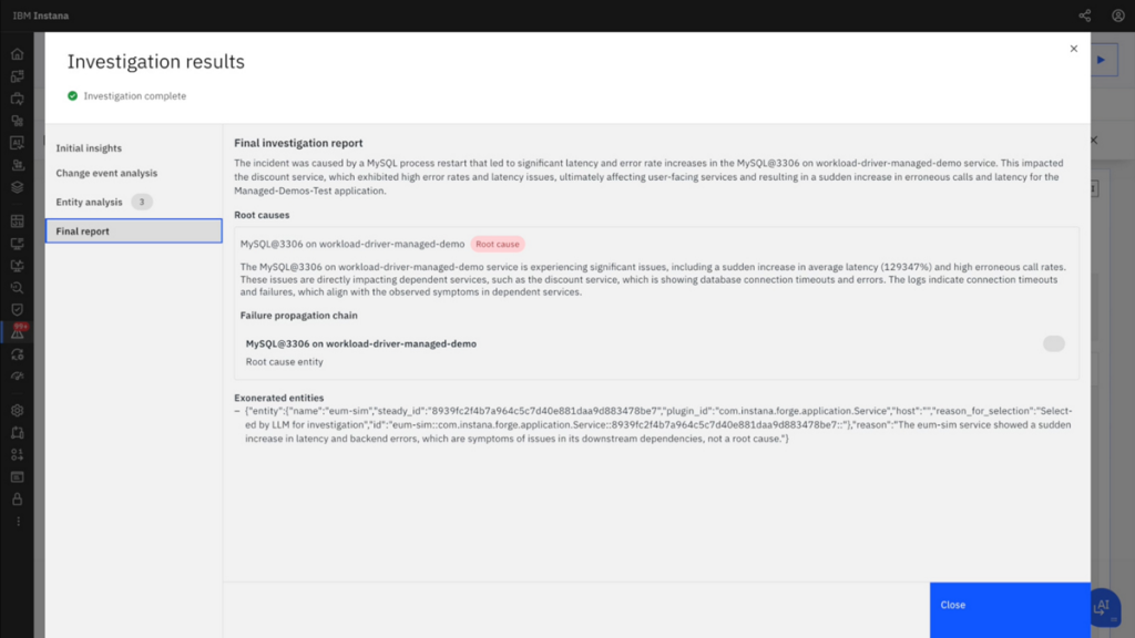 IBM Instana positions itself as full-stack observability powered by agentic AI. Its strongest feature is automatic service discovery and dependency mapping across 300+ technologies – no manual configuration needed. For large enterprises running complex hybrid environments, Instana reduces the time from deployment to full visibility. All OpenTelemetry signals (traces, metrics, logs) are generally available.