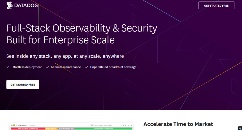 - Unified observability: metrics, logs, APM, RUM, synthetics, security, database monitoring.
