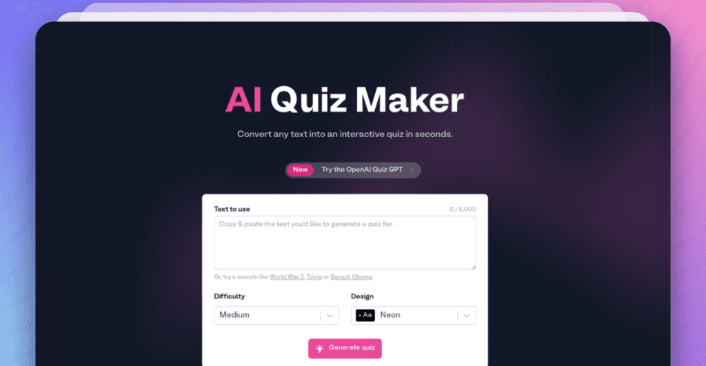For example, if you type “science quiz,” the tool will create multiple-choice or true/false questions based on that topic. This makes it one of the easiest ways to create quizzes without spending hours writing content.