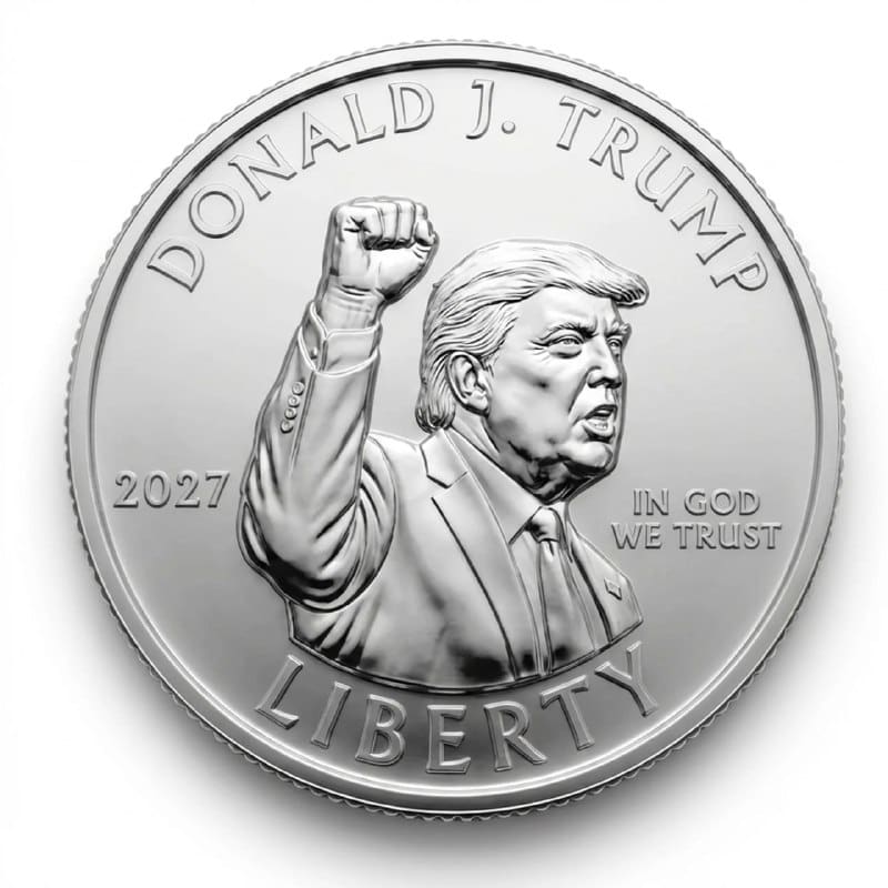 The proposed design features a quarter-dollar coin highlighting an artistic interpretation of Trump’s well-known “Fight, Fight, Fight” stance, an image intended to convey determination and resilience. The design incorporates the inscription “Donald J Trump” along with the phrase “In God We Trust!” and a maintains originality in the background. The coin would also include standard elements such as the year “2027,” “LIBERTY,” “IN GOD WE TRUST,” and “QUARTER DOLLAR” along the base, maintaining the traditional structure of U.S. coinage.