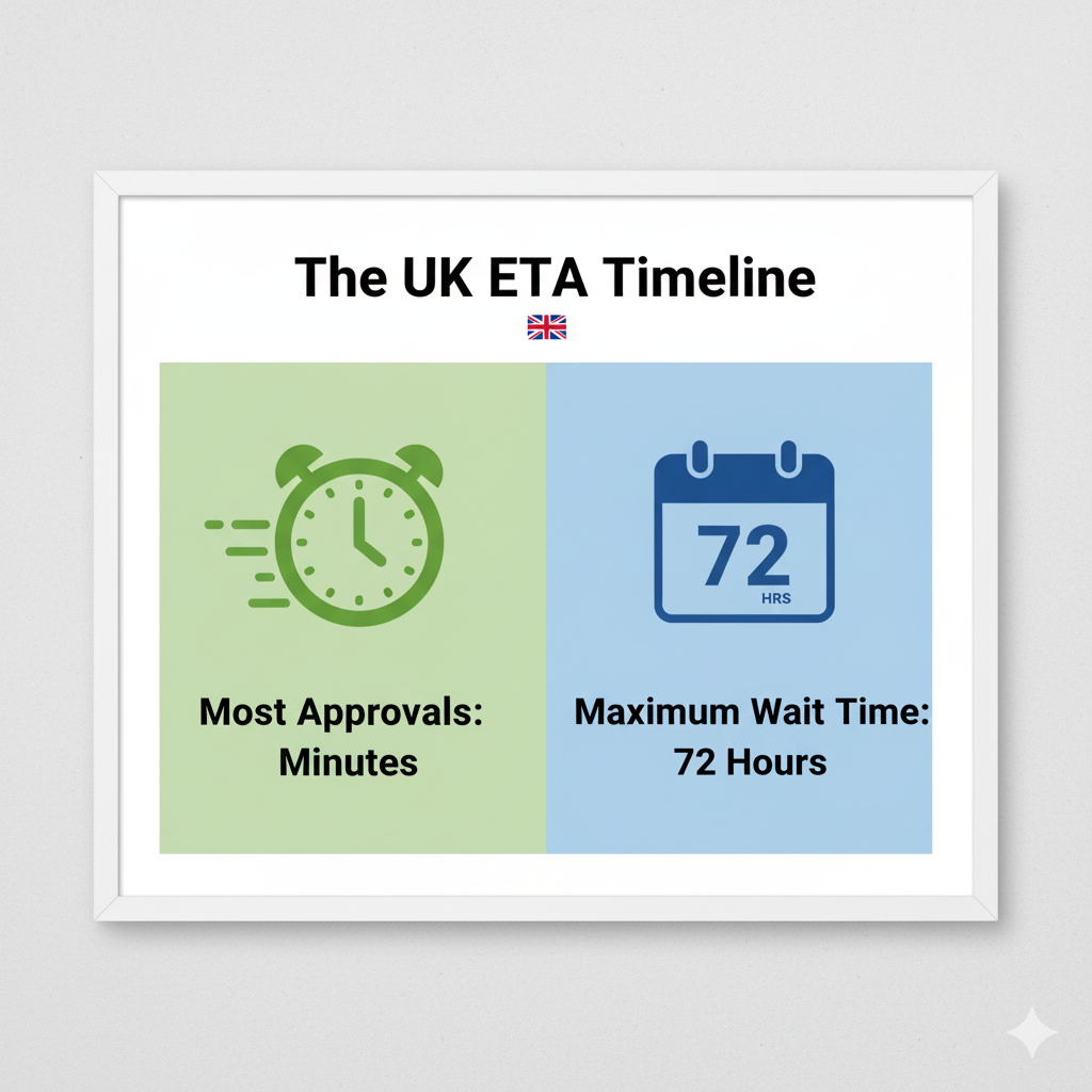 The vast majority of UK ETA applications receive approval within a few hours. Many travelers report getting their approval email within 30 minutes to 2 hours after submission. However, UK authorities state that processing can take up to 72 hours (3 days), so plan accordingly.