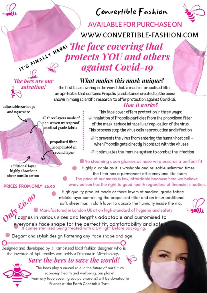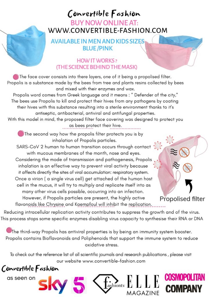 As a consequence, face covering is a necessary commodity for all. Advanced technologies and strict standards are required for the production of a face covering in good quality.Not every mask is the same, you should understand the value of good face covering in the age of digital marketing and the harmful effects of the Covid-19 pandemic. We are offering something that is not ordinary our face covering functions differently from any other mask, part of being a barrier face covering it works by inhaling propolis from a mask that prevents the replication of the virus at the cellular stage.Propolis is a Greek word which mean defender of the city, the mask includespropolis which help to protect from any contamination or dust.