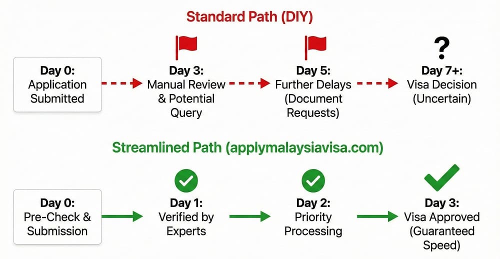 Each step must match Malaysia Immigration guidelines. Errors slow everything down.