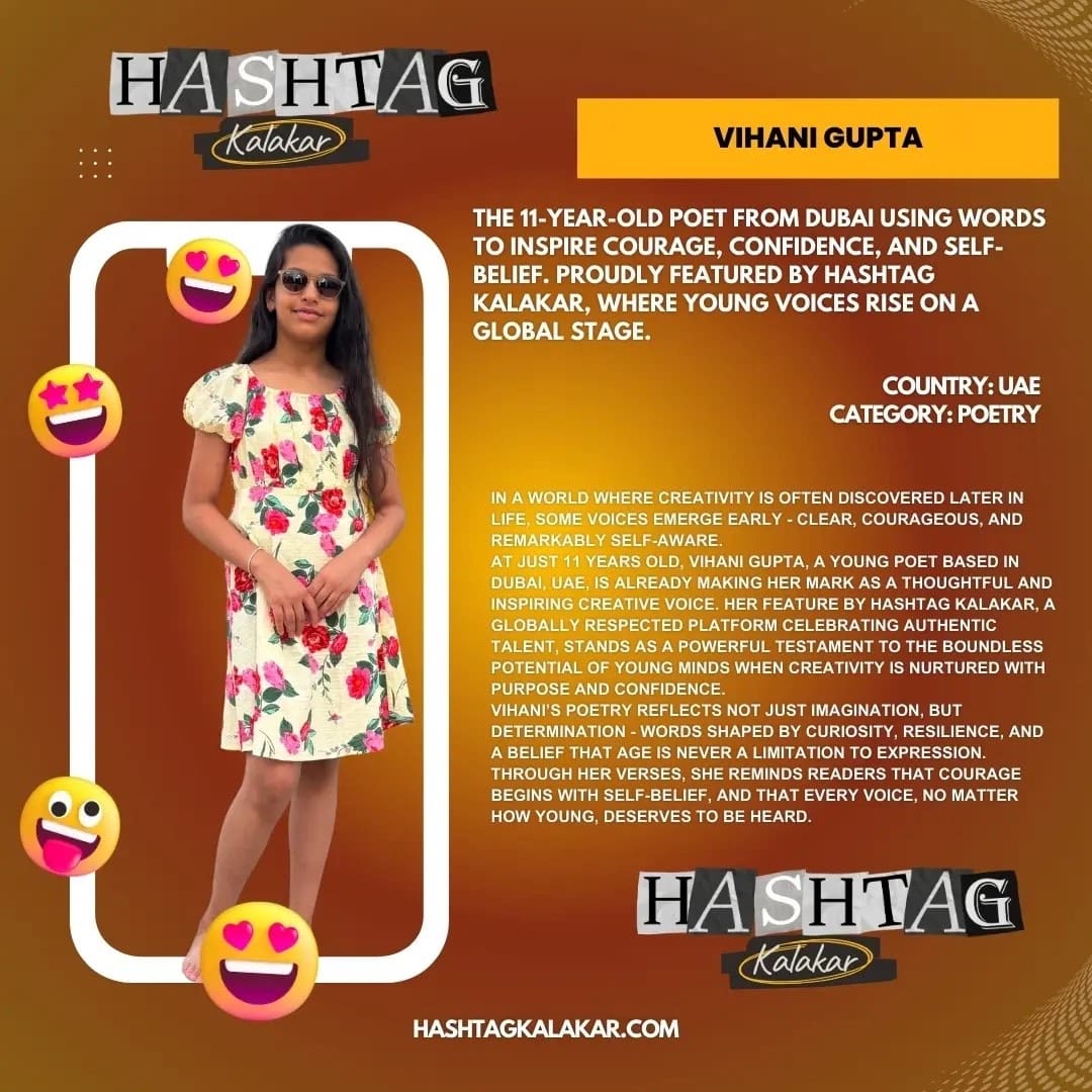 At just 11 years old, Vihani Gupta, a young poet based in Dubai, UAE, is already making her mark as a thoughtful and inspiring creative voice. Her feature by Hashtag Kalakar, a globally respected platform celebrating authentic talent, stands as a powerful testament to the boundless potential of young minds when creativity is nurtured with purpose and confidence.