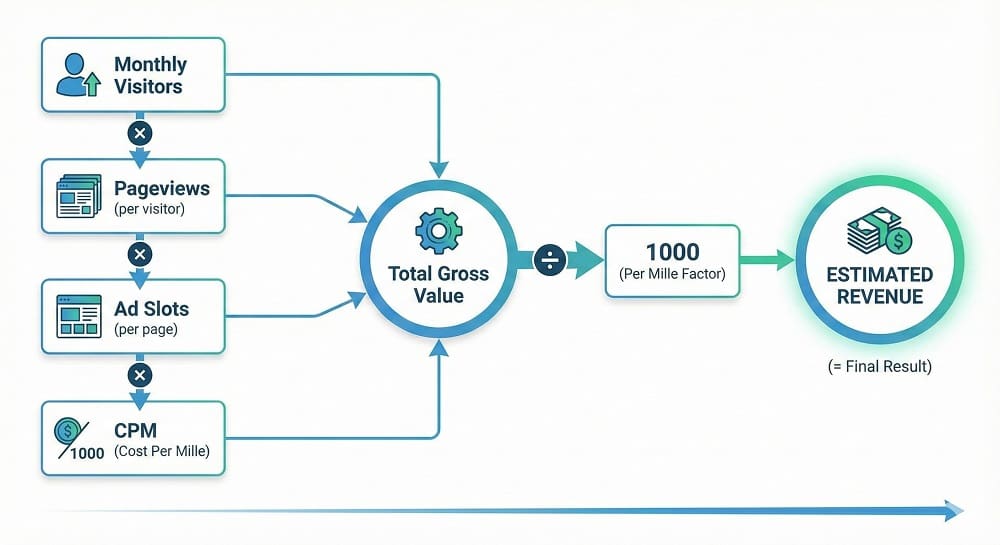 Answer: Use CPM Ă— total ad impressions Ă· 1,000. Include pageviews, ad units, and traffic quality.
