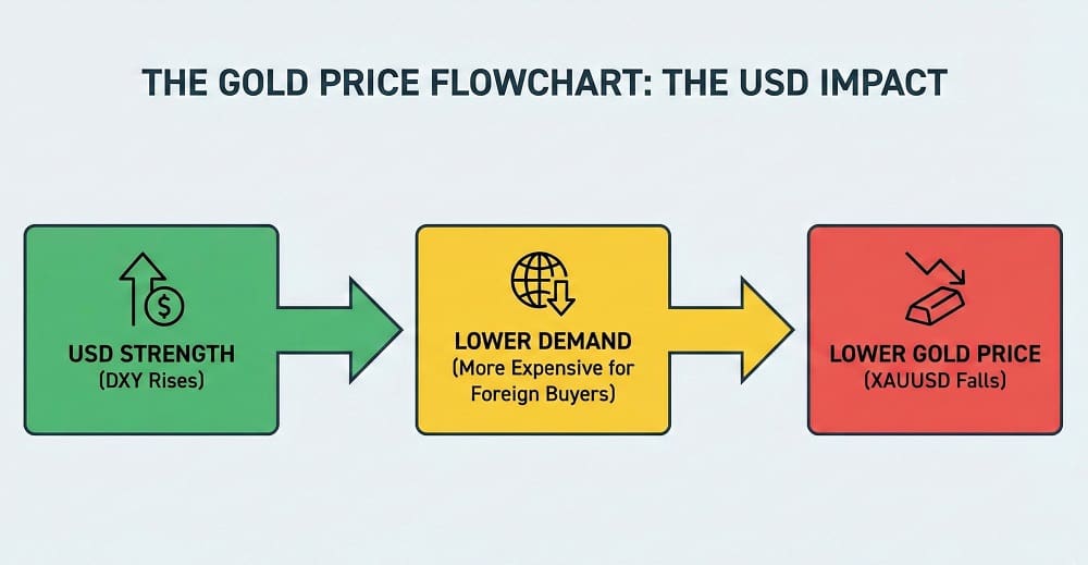 A stronger dollar makes gold more expensive globally, reducing demand and often pushing prices lower.