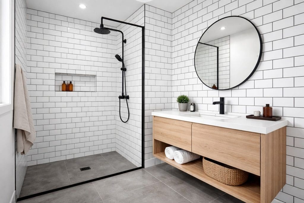 White subway tile looks really good, with grout. This is one of those things that people always like. It is simple. It is nice to look at. It is a choice but it also works with lots of different styles. The black and white together make the walls stand out. White subway tile and black grout give walls some personality so they do not just blend in.