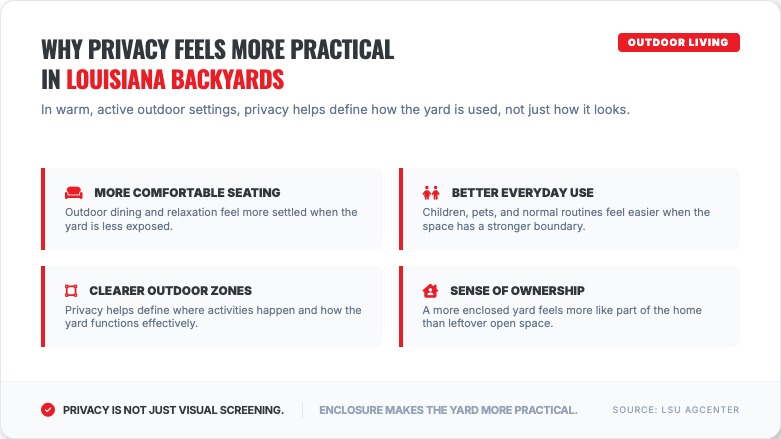 In Louisiana, backyard planning often centers on how outdoor space supports everyday life in a warm, active climate. The LSU AgCenter guidance on privacy fence and plant options reflects the idea that privacy is part of shaping outdoor living areas, not just enclosing them. That perspective matters because it frames privacy as a practical design decision. The right boundary can help define how a yard is used, where activities happen, and how the space feels across changing seasons.