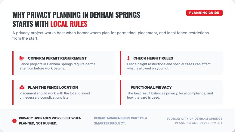 Privacy planning in Denham Springs is not only about preference. It also involves local requirements. The City of Denham Springs fence regulations and permit form make clear that homeowners need a permit before building a fence and that local fence restrictions apply. That matters because a privacy upgrade works best when it is planned correctly from the beginning rather than treated as a quick fix once frustration has already grown.