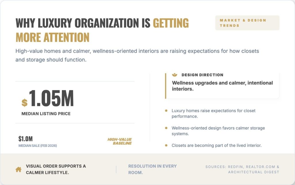 The Greater Phoenix housing context helps explain why this topic is gaining traction. Scottsdale continues to sit within one of the region’s most prominent high-value residential markets. Recent Scottsdale REALTORS market reporting shows citywide median list prices above the million-dollar mark, with much higher pricing in top-tier luxury segments. In homes of that caliber, owners often think beyond square footage and location alone. They also think about how every part of the property performs visually and functionally. That includes spaces such as closets, dressing areas, and storage systems, which increasingly need to match the polish found in kitchens, baths, and primary suites.