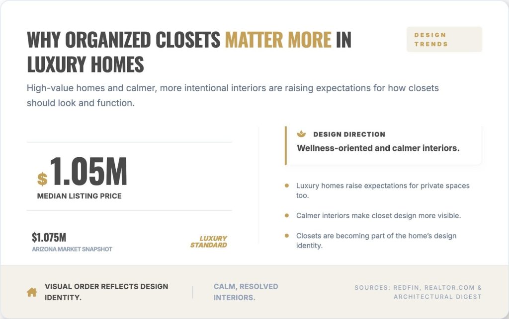 A recent Greater Phoenix-focused article, “Why Luxury Home Organization Is Becoming a Bigger Priority Across Greater Phoenix,” framed this change as part of a broader lifestyle expectation in the local luxury market. Its central point was that affluent homeowners are increasingly treating storage as part of how the home lives and presents itself, rather than just a practical necessity behind closed doors. That local framing is useful because it shows how closet organization is becoming tied to a broader expectation of ease, curation, and visual cohesion across the home.